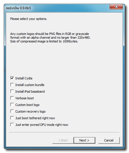 Additional Notes: For iPhone 3GS (New Bootrom) to be able to run Cydia, you must first run your device in the so called “jailbroken state” on every reboot by using “Just boot tethered right now” option in Redsn0w.